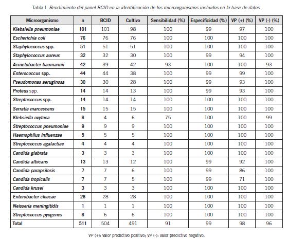 Se identificaron 551 aislados; 511 de ellos estaban incluidos en la base de datos, y la detección global por BCID fue del 91,4% (504/551) y la correspondiente a los microorganismos incluidos en la base de datos fue del 98,6% (504/511), con una especificidad entre el 99% y el 100% en comparación a la identificación obtenida por métodos tradicionales de los microorganismos aislados por subcultivo.