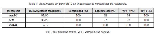 En comparación con los métodos fenotípicos, la sensibilidad en la detección de los genes mecA, vanA/B y blaKPC fue del 100%; los valores de especificidad fueron 97%, 100% y 99,6% respectivamente. En la Tabla II se muestran los resultados discriminados por el mecanismo de resistencia.