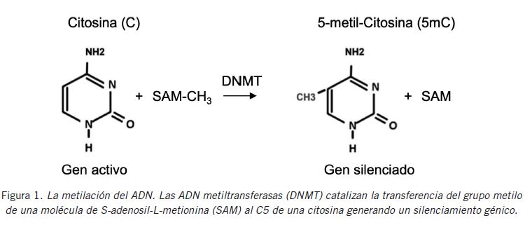 La metilación del ADN. Las ADN metiltransferasas (DNMT) catalizan la transferencia del grupo metilode una molécula de S-adenosil-L-metionina (SAM) al C5 de una citosina generando un silenciamiento génico.