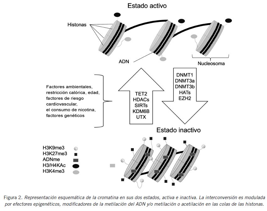 El ADN y su complejo con las histonas (H2A, H2B, H3 y H4) forman la cromatina, que es la unidad básica fundamental para la transcripción o el silenciamiento de genes, la transducción de señales, la reparación y replicación del ADN. La cromatina puede sufrir un proceso de remodelación, pasando de un estado de condensación muy compacto (heterocromatina) a un estado de conformación abierta (eucromatina), lo que permite que factores de transcripción nuclear o proteínas accedan al ADN dando por resultado una alteración en la expresión génica (3). En mamíferos, las modificaciones en la cromatina, como la metilación del ADN y las modificaciones en las histonas, son eventos comunes en las células. La metilación del ADN es un proceso epigenético que transfiere de forma covalente un grupo metilo (-CH3) a las citosinas, principalmente en el sitio del dinucleótido CpG, lo que provoca la represión transcripcional. Por el contrario, la hipometilación del ADN se observa comúnmente en la región codificante de los genes y en las regiones de iniciación de la transcripción en los genes activos. Una situación similar se encuentra en la modificación de las histonas (siempre reversible) que también contribuye a la regulación génica (4).