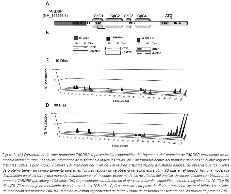 Mientras que en el pasado los datos sobre la metilación del ADN provenían con mayor frecuencia de estudios sobre el cáncer, en la actualidad numerosas patologíasrelacionadas con la edad se han asociado con un contenido aberrante de 5mC. En nuestro laboratorio hemos observado que durante el envejecimiento, muchas proteínas que ligan el ARN modifican sus niveles. Dichos estudios se han focalizado en la proteína TAR DNA binding protein 43 (TDP-43), la cual se une al ARN disminuyendo su nivel en forma específica de tejido. Esta disminución se conserva a través de la evolución, desde Drosophila hasta la especie humana, y se debe al menos en parte, a un incremento en la metilación de ADN (Fig. 3) y modificación de histonas en la región del promotor, que es distinta según el tejido (35) (36). Este fenómeno y sus consecuencias patológicas han sido observados durante el estudio de la esclerosis lateral amiotrófica (ELA o la abreviatura inglesa ALS).