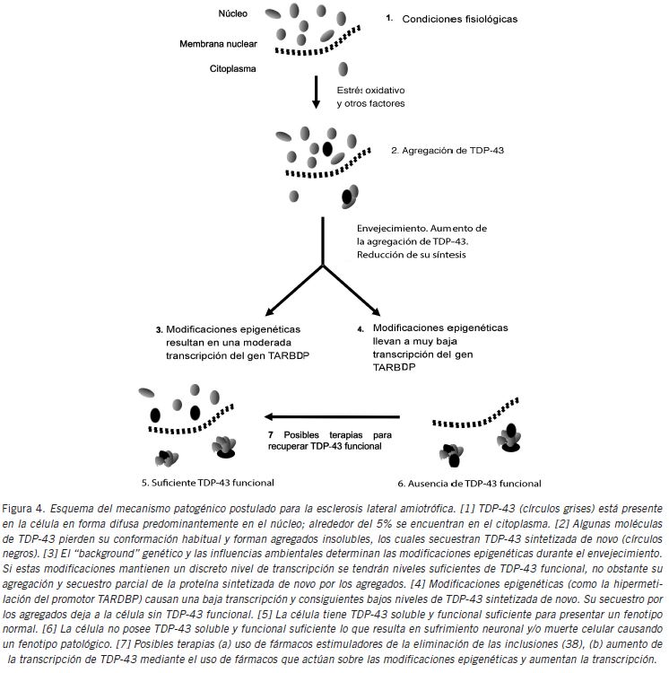 Esquema del mecanismo patogénico postulado para la esclerosis lateral amiotrófica. [1] TDP-43 (círculos grises) está presente en la célula en forma difusa predominantemente en el núcleo; alrededor del 5% se encuentran en el citoplasma. [2] Algunas moléculas de TDP-43 pierden su conformación habitual y forman agregados insolubles, los cuales secuestran TDP-43 sintetizada de novo (círculos negros). [3] El “background” genético y las influencias ambientales determinan las modificaciones epigenéticas durante el envejecimiento. Si estas modificaciones mantienen un discreto nivel de transcripción se tendrán niveles suficientes de TDP-43 funcional, no obstante su agregación y secuestro parcial de la proteína sintetizada de novo por los agregados. [4] Modificaciones epigenéticas (como la hipermetilación del promotor TARDBP) causan una baja transcripción y consiguientes bajos niveles de TDP-43 sintetizada de novo. Su secuestro por los agregados deja a la célula sin TDP-43 funcional. [5] La célula tiene TDP-43 soluble y funcional suficiente para presentar un fenotipo normal. [6] La célula no posee TDP-43 soluble y funcional suficiente lo que resulta en sufrimiento neuronal y/o muerte celular causando un fenotipo patológico. [7] Posibles terapias (a) uso de fármacos estimuladores de la eliminación de las inclusiones (38), (b) aumento de la transcripción de TDP-43 mediante el uso de fármacos que actúan sobre las modificaciones epigenéticas y aumentan la transcripción.