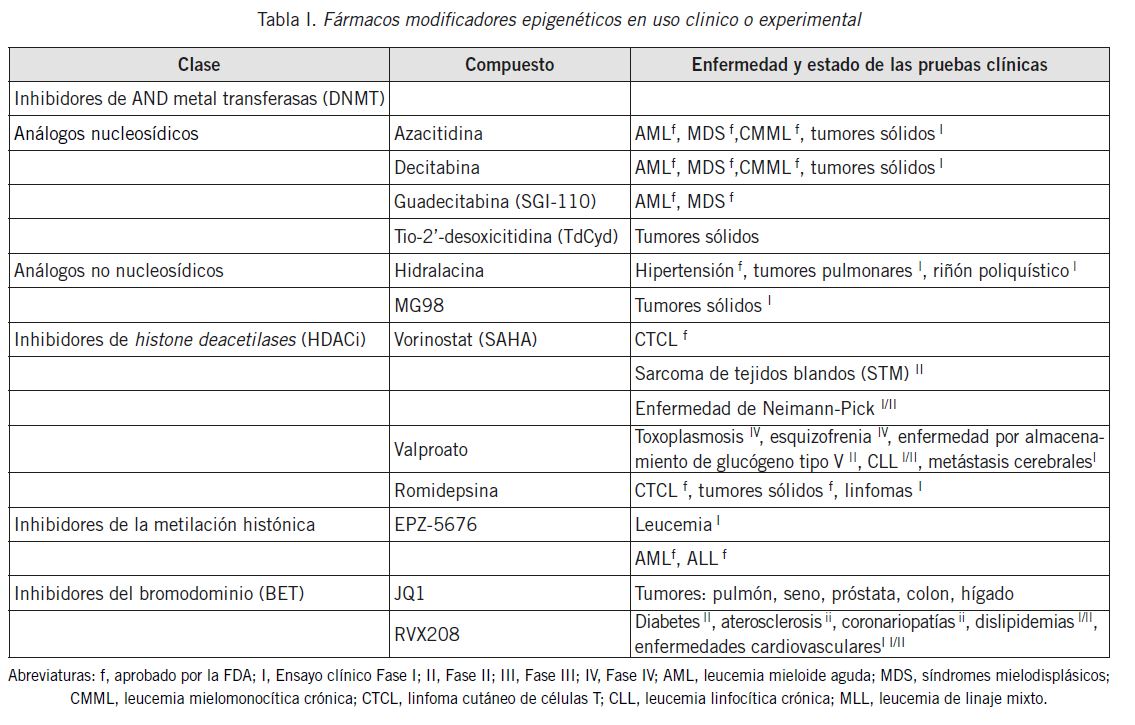 El rol de los mecanismos epigenéticos en enfermedades como ELA, degeneración lobular frontotemporal (DLFT), aterosclerosis y otras, sugiere la posibilidad de utilizar los fármacos epigenéticos, actualmente disponibles, para el tratamiento de estas enfermedades. Algunos de estos medicamentos epigenéticos ya se usan ampliamente en la terapia antineoplásica o en ensayos clínicos relacionados con el cáncer, como los inhibidores de HDAC, los compuestos activadores de las histone deacetylases (como el resveratrol), los inhibidores de la metilación del ADN (como la azacitidina y sus análogos de nucleósidos) y los inhibidores de la metilación de histonas (como los inhibidores de EZH2) (Tabla I). Es importante tener en cuenta para el uso de algunos de estos fármacos, la toxicidad que presentan a largo plazo, que conlleva evaluar cuidadosamente la posología en el caso de enfermedades crónicas.