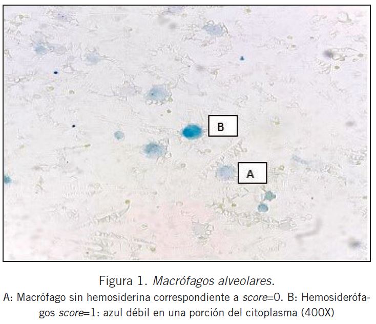 La positividad de la reacción se evidenció mediante la presencia de un precipitado de color azul intenso en el interior de los macrófagos alveolares. Estos fueron evaluados utilizando el siguiente score: ausencia de color =0, azul débil en una porción del citoplasma =1, azul profundo en una pequeña porción de la célula =2, azul intenso en la mayoría de las áreas del citoplasma =3, azul intenso en la totalidad del citoplasma =4. Solamente el score 4 se consideró positivo para realizar el diagnóstico de HAD (Fig. 1) (Fig. 2 ). El punto de corte utilizado para establecer el diagnóstico de HAD fue hemosiderófagos ≥20% (14).