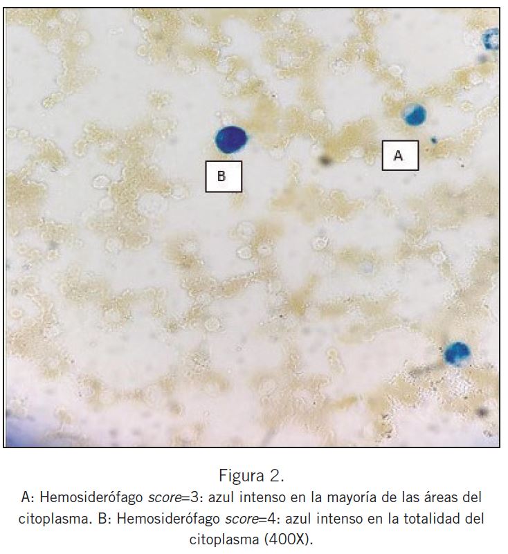 Se analizaron 20 muestras de pacientes sin diagnóstico de HAD como control negativo y no se observaron hemosiderófagos positivos mediante la reacción de Perls.