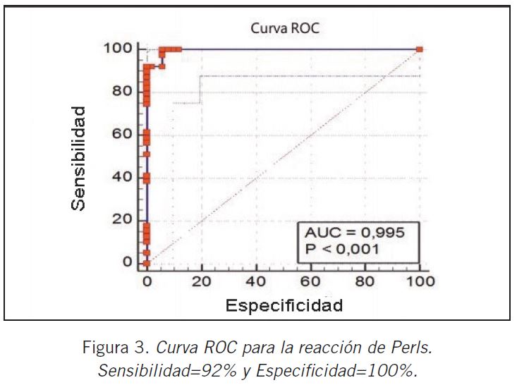 Curva ROC para la reacción de Perls. Sensibilidad=92% y Especificidad=100%.