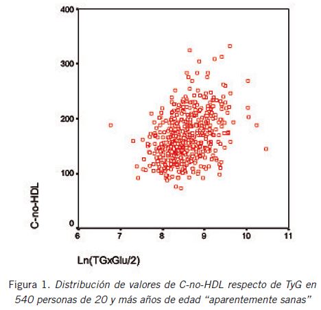 En la Figura 1 se muestra la distribución de los datos de C-no-HDL respecto de TyG en 540 personas de 20 años y más de edad “aparentemente sanas”. Se halló una correlación muy significativa entre TyG y C-no- HDL, r= 0,377, p<0,001, recta de regresión C-no-HDL = 33,64 * TyG – 122,57.