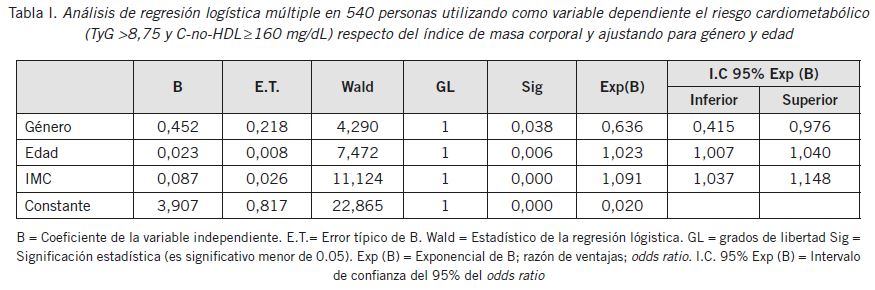 Se realizó un estudio de regresión logística múltiple con el que se analizó el RCM respecto del IMC, ajustando por edad y género. Se utilizó el RCM (TyG >8,75 y C-no-HDL ≥160 mg/dL) como variable dependiente y como variables independientes: IMC, el género (masculino= 1; femenino=2) y la edad. Los resultados se muestran en la Tabla I. Se observa que el RCM estuvo muy significativamente relacionado con el IMC, aunque también aportan en forma significativa a su presencia la edad de las personas y el género masculino.