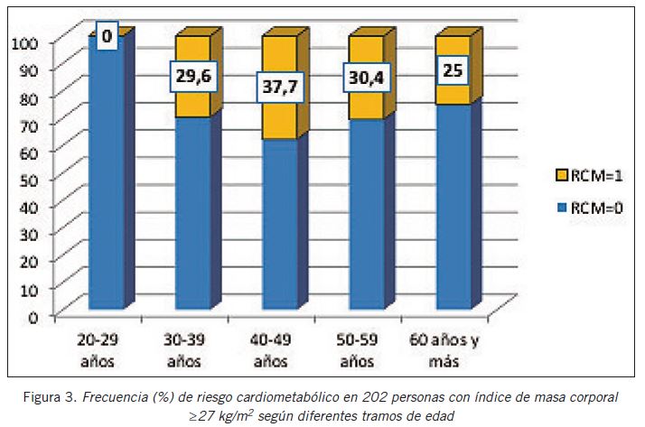 Se estudió la frecuencia de RCM en las personas con IMC ≥27 kg/m., teniendo en cuenta los diferentes tramos de edades (20-29 años, n=5; 30-39 años, n=54; 40-49 años, n=61; 50-59 años, n=46; 60 y más años, n=36) y en la Figura 3 se muestran lo resultados. Se observa que RCM estaba presente en un tercio de las personas con IMC ≥27 kg/m2, pero los resultados también señalaron que es muy frecuente hallar personas con sobrepeso u obesidad sin presencia de este indicador de RCM.
