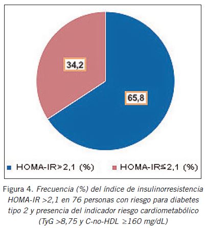 Frecuencia (%) del índice de insulinorresistencia HOMA-IR >2,1 en 76 personas con riesgo para diabetes tipo 2 y presencia del indicador riesgo cardiometabólico (TyG >8,75 y C-no-HDL ≥160 mg/dL)