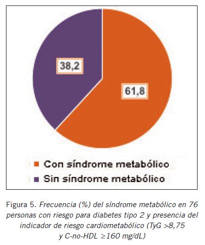 Se concluye que, desde el laboratorio bioquímico clínico, el indicador RCM (asociación de TyG >8,75 y C-no-HDL ≥160 mg/dL) podría ser de interés para la detección de grupos poblacionales con alto riesgo cardiometabólico en la prevención de ECVA y DT2.
