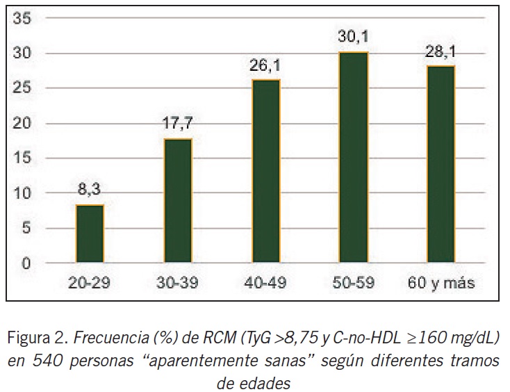Frecuencia (%) de RCM (TyG >8,75 y C-no-HDL ≥160 mg/dL) en 540 personas “aparentemente sanas” según diferentes tramos de edades
