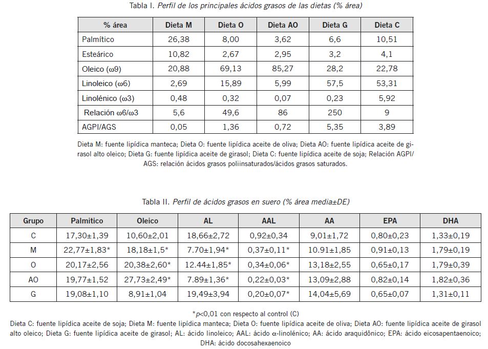 En la Tabla I se presenta la concentración de los ácidos grasos palmítico, esteárico, oleico, AL y AAL de las dietas utilizadas. Con los datos obtenidos por cromatografía gaseosa se calcularon la relación ω6/ω3 (valor normal 10:1) y la relación AGPI/AGS (valor normal >1,5).