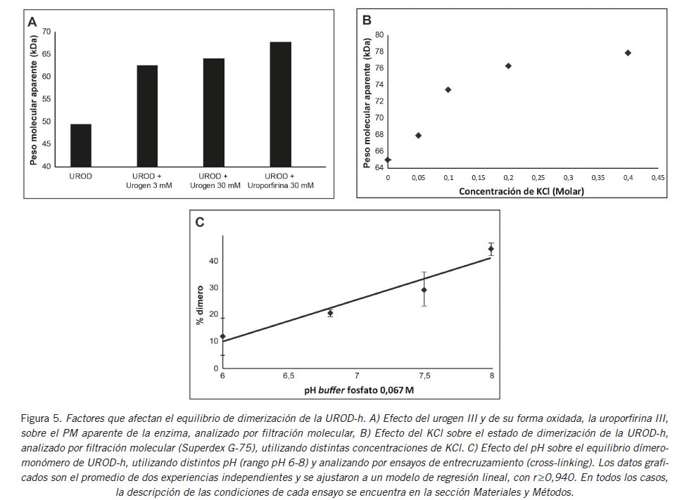 El objetivo de este trabajo fue estudiar la relación entre la dimerización de la enzima y su actividad enzimática y comprobar si la dimerización de UROD-h es imprescindible, tanto para la primera etapa de la reacción (urogen→heptagen) como para la segunda etapa (heptagen→coprogen). Con ese objetivo, se expresó y purificó a homogeneidad la UROD-h, se analizó el comportamiento dímero-monómero bajo distintas condiciones que pudieran desplazar el equilibrio de dimerización y se evaluó la actividad enzimática en dichas condiciones. Los resultados obtenidos sugieren que la especie activa para la primera etapa de la reacción es el homodímero y, tanto el dímero como el monómero, se comportan como especies activas para la segunda etapa de la reacción. Finalmente, se analizaron las implicancias de estos resultados para la comprensión del mecanismo de reacción de la UROD y su relación con enfermedades humanas tales como la PCT y la HEP.