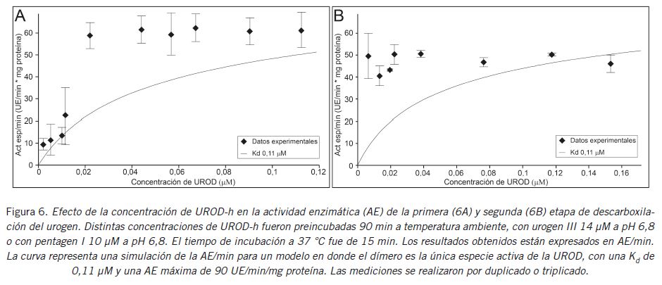 Los resultados obtenidos, tanto para urogen III como para pentagen I, se muestran en las Figuras 6A y 6B respectivamente. En ambos casos se graficó también una curva teórica que representa el aumento de la AE en función de la concentración molar de la enzima, siguiendo un modelo dímero ↔ monómero, en donde la única especie activa es el dímero. Para urogen III no se observaron cambios significativos en la actividad UROD-h, en un rango de concentraciones entre 0,02 y 0,11 µM (1-5 µg de UROD-h) (Fig. 6A).