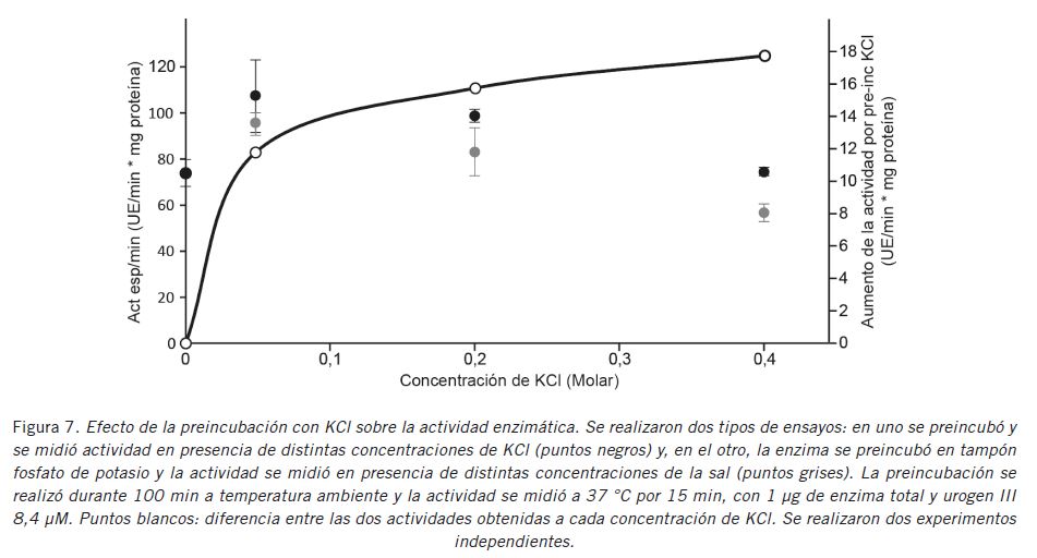 Por último, se determinó la AE en función de la concentración de sal agregada para desplazar el equilibrio dímero-monómero y también los valores de actividad en presencia de KCl (actuando sobre la catálisis, o sea agregándolo solo al medio de incubación, sin preincubar con la UROD-h). Luego se graficó la diferencia entre cada par de valores y se observó un incremento de la AE con la fuerza iónica del medio (Fig. 7, línea curva), que, asociado al incremento observado de la dimerización en esas mismas condiciones (Fig. 7), sugiere que la especie activa para la descarboxilación es la forma homodimérica de la enzima.