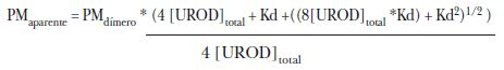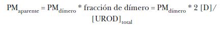 Donde PMaparente es el PM estimado a través de los valores obtenidos de Ve/Vo en la columna de filtración molecular y PMdímero es el PM del dímero de la UROD cuando todas las moléculas que eluyen de la filtración molecular se encuentran en forma dimérica (fracción de dímero igual a 1).