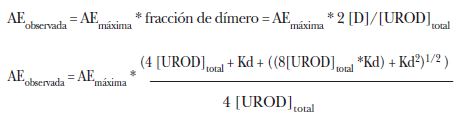 Para el caso de la actividad enzimática, suponiendo que la única especie activa es el dímero de la UROD (monómeros no activos), la AE vendría dada por: