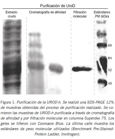 Se logró expresar la enzima UROD-h clonada en E. coli BL21 (DE3) pLys y purificar hasta homogeneidad por medio de cromatografía de afinidad con iones metálicos inmovilizados (IMAC, Hist-tag) y filtración molecular Superdex 75. A partir de la elución de la cromatografía de afinidad se obtuvieron dos picos, que indican dos fuerzas de interacción distintas, que podrían corresponder a los dos estados oligoméricos de la proteína (dímero y monómero). Posteriormente se verificó el grado de pureza obtenido a través de electroforesis en SDS-PAGE (Fig. 1), el cual mostró que el primer pico de elución se encontraba impurificado con otras proteínas. Para dicha muestra, se realizó un nuevo paso de purificación por filtración molecular Superdex 75 y se obtuvo una única banda, con un PM promedio de 52±2 kDa, correspondiente al monómero de la UroD-6xHis (PM teórico 45 kDa) (Fig. 1, cuarta calle).