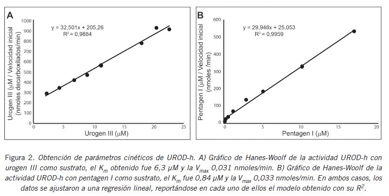 Los ensayos cinéticos con la proteína purificada evidenciaron actividad enzimática, tanto para la descarboxilación de uroporfirinógeno III (urogen III) como del pentaporfirinógeno I (pentagen I). A todas las concentraciones de urogen III ensayadas, se observaron porcentajes de descarboxilación en el rango 30-35%. Debido a que los datos no se encontraron distribuidos homogéneamente y fueron muy cercanos, sobre todo a valores bajos de 1/[pentagen I], también se analizaron según el método de Hanes-Woolf, que se recomienda en estos casos (Fig. 2), con ambos sustratos. A partir de esos gráficos se obtuvo, con urogen III, un Km de 6,3 µM y una Vmax de 0,031 nmoles/min (Fig. 2A). El valor de Km difiere del obtenido por de Verneuil et al. (21) que fue de 0,04 µM, probablemente debido a que usaron una mayor concentración de sustrato (tratando de acercarse a la saturación) y, a altas concentraciones, parte del sustrato se oxida durante la incubación provocando una menor Vmax y una menor afinidad, dado que el sustrato oxidado inhibe competitivamente la reacción (21).