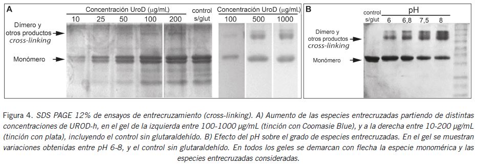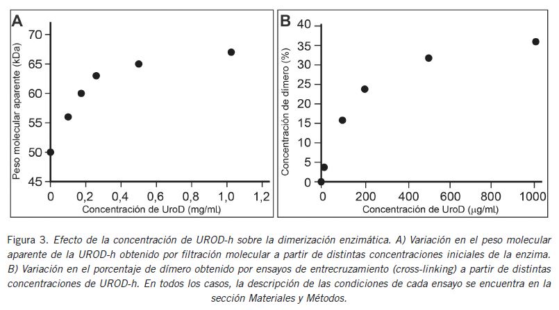 Por su parte, los ensayos de incubación de distintas concentraciones de UROD-h con glutaraldehído presentaron también una curva hiperbólica (Fig. 3B). El porcentaje de dímero presente se estimó a partir de la cuantificación de las bandas de dímero y monómero obtenidas (Fig. 4A) y mostró un incremento del dímero en función de la concentración inicial de UROD-h utilizada en el ensayo.