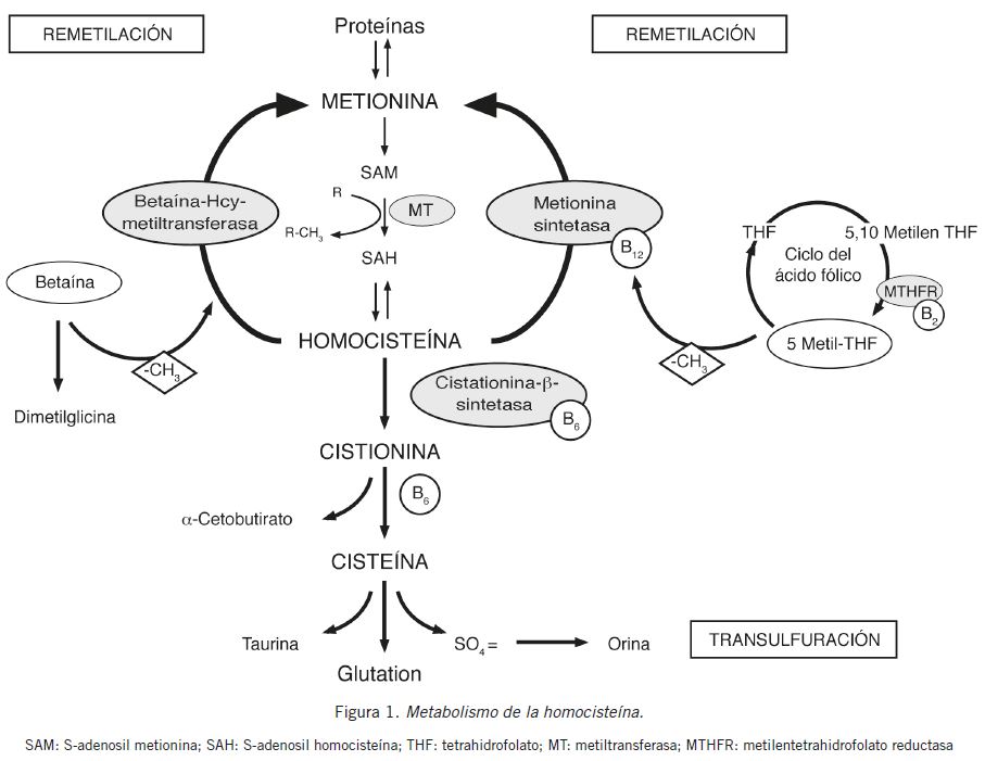 Dado que la MS se distribuye en casi todas las células del organismo mientras que la BHMT se encuentra principalmente en el hígado, la vía más importante de remetilación de Hcy a MET es la que utiliza MS como enzima catalizadora. Además, este camino está íntimamente relacionado con los ciclos metabólicos de la vitamina B12 y del ácido fólico. La MS convierte la forma circulante de folato (5-metilTHF) en THF, el cual interviene en diversas reacciones celulares fundamentales. Luego, el THF es convertido a 5,10-metilenTHF el que, a su vez, por acción de la metilentetrahidrofolato reductasa (MTHFR) y de riboflavina (vitamina B2) como cofactor, es reducido a 5-metilTHF. Cabe destacar que este ciclo metabólico es fuertemente dependiente de la disponibilidad de cobalamina, ya que esta vitamina es la aceptora del metilo aportado por el 5-metilTHF. Así, la metilcobalamina generada es la molécula intermediaria responsable de ceder el grupo metilo a la Hcy, reconvirtiendo el aminoácido a MET. Esta interacción entre folato y cobalamina es esencial para la síntesis normal de purinas y pirimidinas y, por lo tanto, de ADN, como así también del control de los niveles de MET y de 5-adenosilMET (metabolitos esenciales para la metilación de lípidos, proteínas, ADN, etc.). Dada la estrecha interrelación entre los ciclos metabólicos descriptos, las deficiencias de folato y/o de vitamina B12 afectarían las reacciones mencionadas. Además, el déficit de vitamina B12 limita la disponibilidad de folato ya que éste quedaría “atrapado” como metiltetrahidrofolato (“hipótesis de la trampa de folato”).