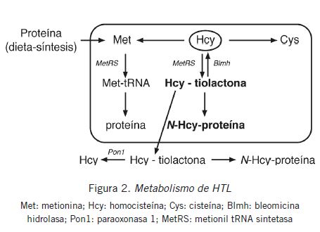 Met: metionina; Hcy: homocisteína; Cys: cisteína; Blmh: bleomicinahidrolasa; Pon1: paraoxonasa 1; MetRS: metionil tRNA sintetasa