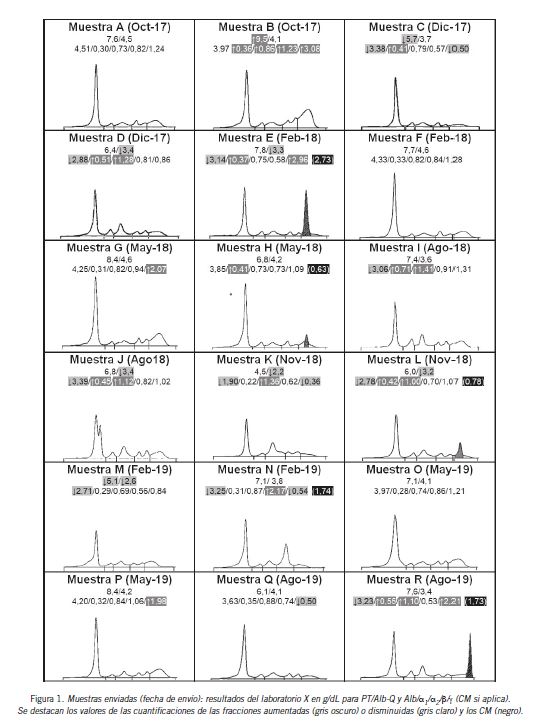 Los parámetros evaluados fueron: proteínas totales (PT) y albúmina por método químico (Alb-Q), fracciones del PRE-EC (Alb, α1, α2, β, γ) en concentración absoluta/relativa (incluyendo la cuantificación de componentes monoclonales (CM) si los hubiere) y el comentario interpretativo (observaciones y sugerencias). La interpretación del perfil debía realizarse asumiendo el primer ingreso de un paciente masculino de 50 años. El informe de resultados por parte de los laboratorios participantes se realizó a través de un formulario en línea.
