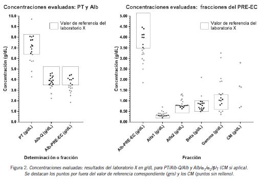Cabe destacar que no todos ellos se sumaron a la propuesta desde el primer momento, sino que fueron incorporándose a medida que el proyecto tomó difusión. Los resultados se analizaron tomando los datos del laboratorio X como valores comparadores, utilizando el cálculo recomendado por la guía GP29-A2 (15), el cual estima una diferencia permitida como D=Z1-α/2*√(σi2+σx2/nx+σy2/ny); donde Z=1,96, σi= variabilidad interlaboratorio, σx=σy= variabilidad intralaboratorio de cada laboratorio, nx=ny= número de replicados en cada laboratorio. La variabilidad intralaboratorio del laboratorio X (CVx%) se obtuvo por el procesamiento en 20 días consecutivos de un pool de muestras (PT: 1,2%, Alb-Q: 1,3%, Alb: 1,8%, α1: 3,5%, α2: 3,7%, β: 4,8%, γ: 3,6%). Se consideró un desempeño equivalente (CVx%= CVy%) para los laboratorios participantes (Y). La variabilidad interlaboratorio (CVinter%) se obtuvo de informes de CEC del PEEC y del CAP. Del PEEC se obtuvieron los CVinter% promedio de todas las marcas/equipos/reactivos del período 06-08/2017 para PT (5,1%) y Alb-Q (6,3%); mientras que los CVinter% del fraccionamiento proteico se obtuvieron del análisis del grupo par del envío ELP-B 2017 del CAP, a saber: Alb: 4,1%, α1: 9,3%, α2: 6,8%, β: 6,6%, γ: 13,4%. Se decidió que las muestras fueran procesadas por simplificado en cada laboratorio (nx=ny=1) por motivos de costos y conveniencias prácticas.