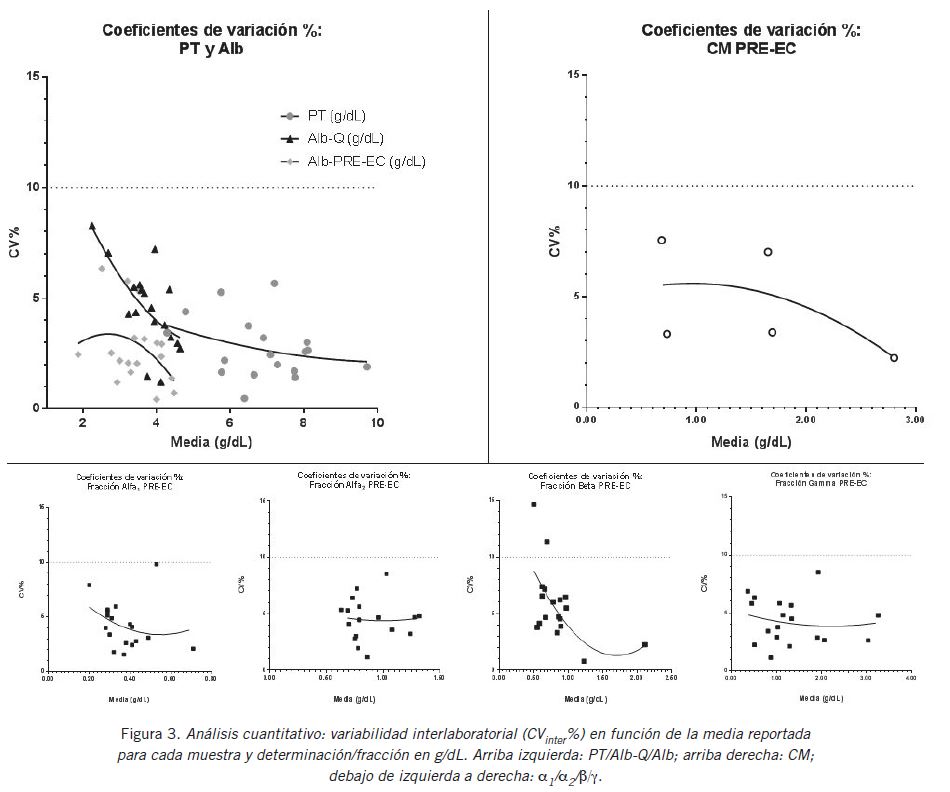 Se destacó el elevado porcentaje de resultados aceptados para todas las determinaciones/fracciones contemplando la totalidad de envíos/muestras/laboratorios. Aún más, el 4% de los resultados que fueron rechazados según el cálculo contemplado para el análisis, pudo explicarse a través de distintas causas, la mayoría de las cuales no dependían del fraccionamiento proteico por EC. Algunas de ellas involucraron la decisión por parte de algunos laboratorios participantes de no informar resultados de Alb-Q por presentar discrepancias respecto al valor de Alb o de no informar la cuantificación de un CM con movilidad de beta globulina. En paralelo, el control interlaboratorial demostró su utilidad en detectar un sesgo negativo en los resultados de Alb-Q de un laboratorio para ambas muestras de un mismo evento.