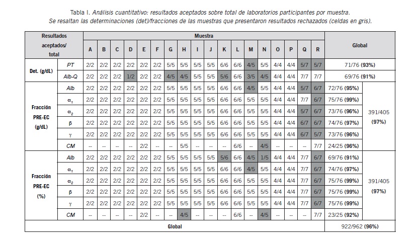 Desagregando por determinación/fracción, los porcentajes de resultados aceptados fueron: PT 93% (71/76), Alb-Q 91% (69/76) y fraccionamiento proteico por PRE-EC global 91% (391/405), tanto en g/dL (Alb 95%, α1 99%, α2 96%, β 97%, γ 99%) como en % (Alb 91%, α1 97%, α2 99%, β 99%, γ 99%, CM 92%).