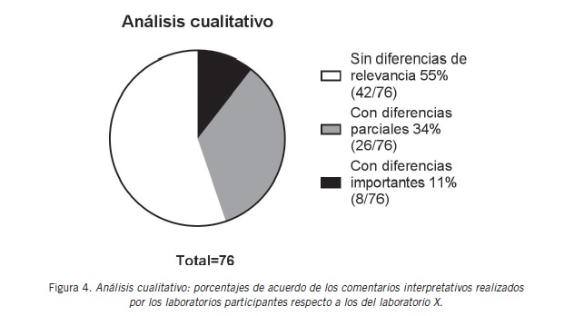 Tal como se estableció en los objetivos del presente estudio y sólo a los efectos de este análisis, se compararon los distintos comentarios interpretativos realizados por los laboratorios participantes con los del laboratorio X y se obtuvo un: