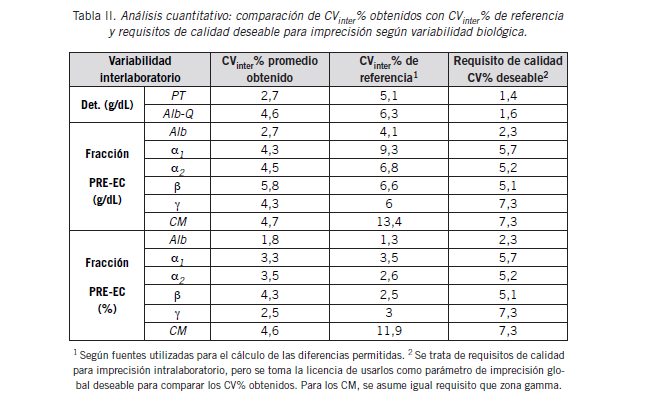 La variabilidad interlaboratorial estimada a través del CV% promedio de todas las muestras para cada determinación/fracción se muestra en la Tabla II, junto con los parámetros de comparación de referencia y requisitos de calidad para la imprecisión según variabilidad biológica. Los CVinter% promedio obtenidos se encuentran en el rango 1,8%-5,8% para todas las determinaciones/ fracciones. Todos ellos son inferiores al CVinter% de referencia utilizado en el cálculo de la diferencia máxima permitida, a excepción de los resultados en % de Alb (1,8% vs. 1,3%), α2 y β (α2 3,5% vs. 2,6% y β 4,3% vs. 2,5%). El CVinter% promedio de la cuantificación de CM en g/dL fue de 4,7%, con un CVinter% de 7,5% para el CM de menor concentración (0,63 g/dL).