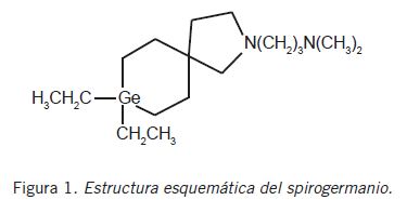 En consecuencia, cuando la búsqueda de nuevos compuestos con actividad antitumoral pasó de estudios con metales de transición a los de elementos representativos, el germanio pasó a ser una opción razonable, junto a sus vecinos en el Sistema Periódico, galio y estaño (10) (11). En particular, dos compuestos órganogermánicos fueron investigados intensivamente tanto a nivel de laboratorio como en estudios clínicos: el spirogermanio y el así llamado Ge-132.
