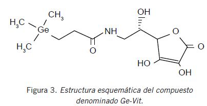 Un compuesto muy interesante, preparado hace pocos años y denominado Ge-Vit (Fig. 3), puede obtenerse conjugando el sencillo compuesto órgano-germánico (CH3)3Ge-CH2-CH2-CO(OH) con ácido ascórbico (vitamina C). Se genera una especie soluble en agua que muestra una excelente actividad para el tratamiento de la dermatitis atópica (una enfermedad inflamatoria crónica de la piel, muchas veces asociada con otras enfermedades como el asma y la rinitis alérgica) (24), y que eventualmente abre interesantes perspectivas farmacológicas para este nuevo tipo de compuestos organometálicos de germanio.