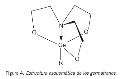 Otro grupo de compuestos órgano-germánicos con actividad farmacológica que fue investigado reiteradamente es el de los así llamados germatranos. Se trata de compuestos tricíclicos, derivados de la trietanolamina (5-aza-2,8,9-trioxo-1-germatriciclo[3.3.3.0]undecano) los que en años recientes han recibido considerable atención no sólo por sus inusuales propiedades químicas y físicas, sino también por su amplio espectro de actividad biológica (9) (25). Se han propuesto diferentes métodos para la síntesis de estos compuestos (25) (26) y, como se muestra en la Figura 4, ellos contienen un átomo de germanio hipervalente con un enlace transanular a un átomo de nitrógeno (longitudes de enlace Ge-N entre 2,01 y 2,29 Å), que es el responsable de su estabilidad química (9) (26) (27). La toxicidad y actividad biológica de estos compuestos depende fuertemente de las características del residuo R (9) (27).