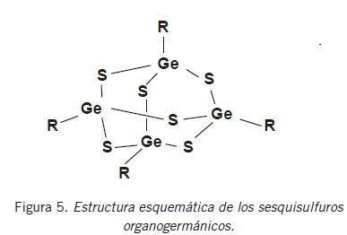 Un importante número de compuestos de este tipo ha demostrado poseer una muy interesante actividad antitumoral y neurotrópica (9) y, por esta razón sería muy valioso seguir en la exploración y el estudio de los mismos. También es interesante de mencionar, dentro de esta misma línea de investigación, la preparación y estudio de propiedades de una gran variedad de sesquisulfuros organogermánicos del tipo mostrado esquemáticamente en la Figura 5. En experiencias con animales, estos compuestos mostraron en general, una excelente actividad antitumoral y a dosis más bajas que el Ge-132, así como también una buena actividad antioxidante (11).