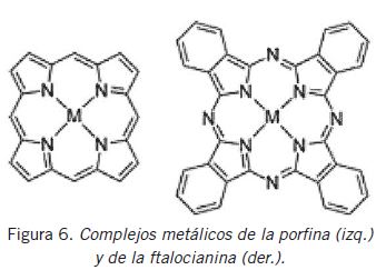 Complejos metálicos de la porfina (izq.) y de la ftalocianina (der.).