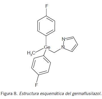 Finalmente, es interesante mencionar la posibilidad de introducir germanio en el bien conocido y ampliamente utilizado fungicida flusilazol. Este compuesto (bis(4-fluorofenil)(metil)(1H-1,2,4-triazol-1-ilmetil) silano), que es un fungicida organosilícico desarrollado por DuPont, es utilizado como agente antimicótico para controlar hongos en una variedad de frutas y verduras y otros cultivos (40). Su estructura cristalina y molecular fue determinada en 1989 (41) y algunos años después fue posible sintetizar el compuesto análogo de germanio, esto es, reemplazar el Si por Ge en esta molécula (42). El germaflusilazol (Fig. 8), como fue denominado, mantiene una excelente actividad fungicida (9) (42) y todo su comportamiento biológico resulta ser totalmente análogo al del flusilazol (42).