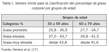 Valores límite para la clasificación del porcentaje de grasa corporal por grupos de edad.