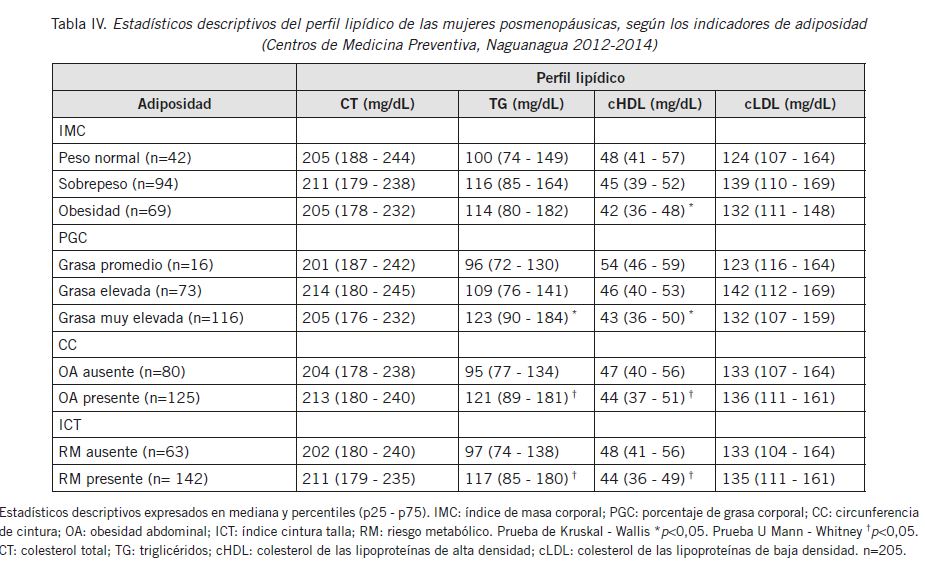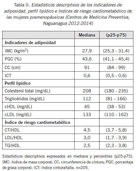 Fuente: Herrera et al. (17).Estadísticos descriptivos de los indicadores de adiposidad, perfil lipídico e índices de riesgo cardiometabólico de las mujeres posmenopáusicas (Centros de Medicina Preventiva, Naguanagua 2012-2014)