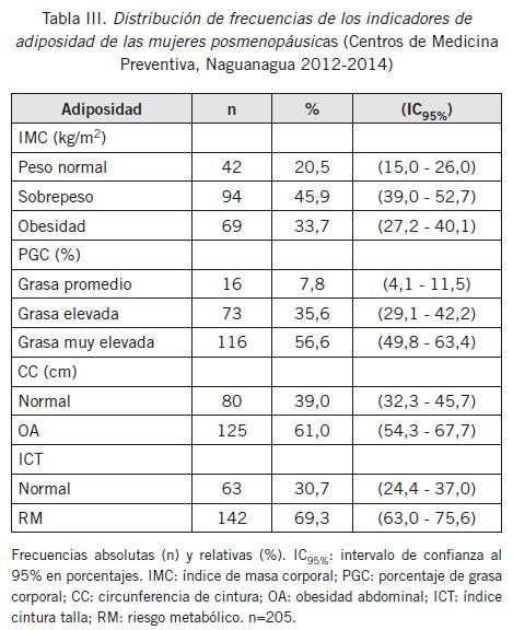 Estadísticos descriptivos expresados en mediana y percentiles (p25-p75). IMC: índice de masa corporal; CC: circunferencia de cintura; PGC: porcentaje de grasa corporal; ICT: índice cintura/talla. n=205.La distribución de frecuencia de los indicadores de adiposidad (Tabla III) muestra que la mayor parte de las mujeres evaluadas (79,6%) presentó exceso de peso (sobrepeso u obesidad) según el IMC; 92,2% exceso de grasa corporal (grasa elevada y muy elevada) de acuerdo con el PGC; 61% obesidad abdominal conforme a la CC y 69,3% RM según el ICT.