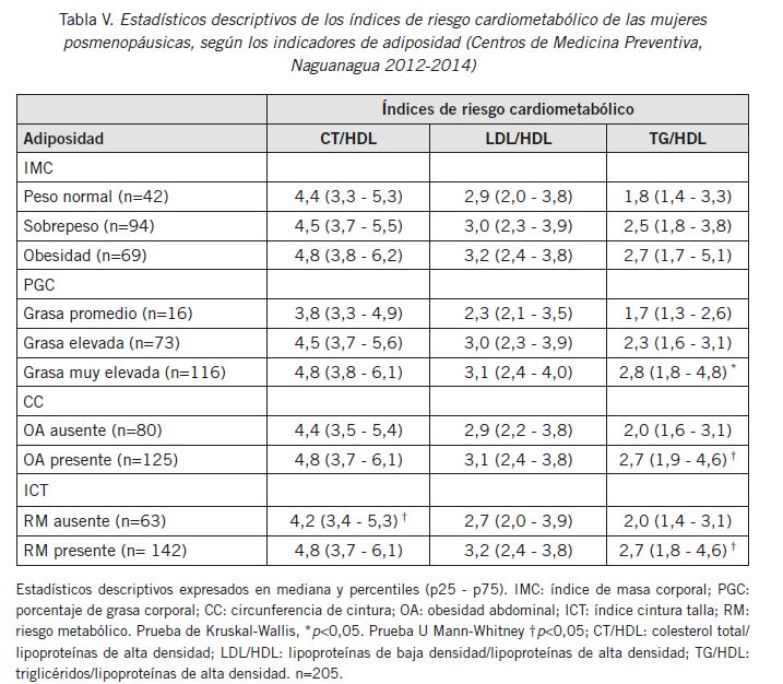 Los estadísticos descriptivos del perfil lipídico y de los índices de riesgo cardiometabólico de las mujeres posmenopáusicas según los diferentes indicadores de adiposidad se muestran en las Tablas IV y V, respectivamente.