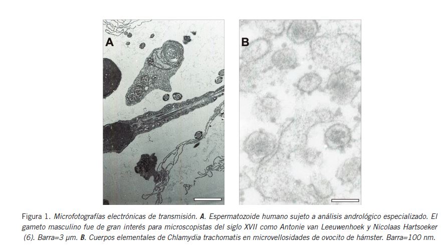 A. Espermatozoide humano sujeto a análisis andrológico especializado. El gameto masculino fue de gran interés para microscopistas del siglo XVII como Antonie van Leeuwenhoek y Nicolaas Hartsoeker (6). Barra=3 μm. B. Cuerpos elementales de Chlamydia trachomatis en microvellosidades de ovocito de hámster. Barra=100 nm.