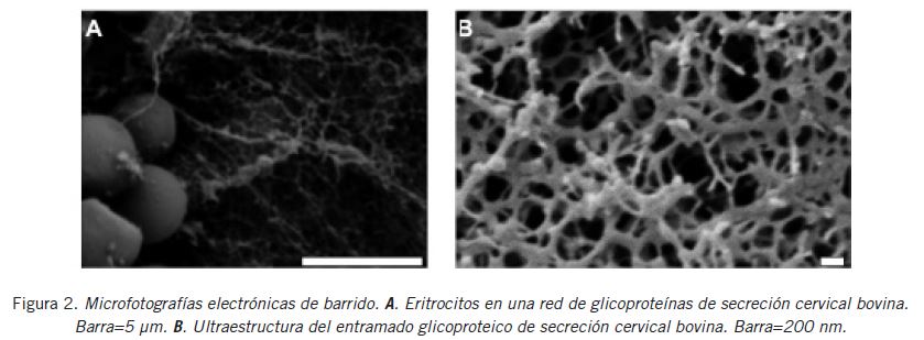 A. Eritrocitos en una red de glicoproteínas de secreción cervical bovina.Barra=5 μm. B. Ultraestructura del entramado glicoproteico de secreción cervical bovina. Barra=200 nm.