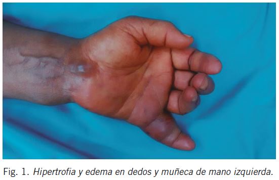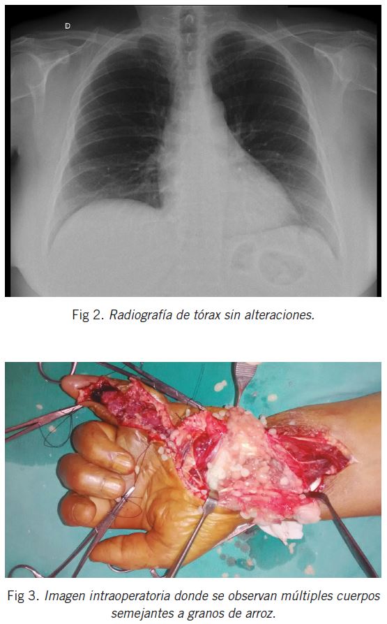 Se presenta el caso de una mujer de 48 años de edad, residente de zona rural de Ticino, Córdoba, quien acudió al hospital por presentar hipertrofia y edema en dedos de mano izquierda, tejido y mucosa (Fig. 1). Refirió haber sido trabajadora rural. Como antecedentes presentó, cuatro años previos a la fecha de la consulta, una cirugía para descompresión del túnel carpiano realizada en otro centro y, dos años después, comenzó con edema y dolor en la mano izquierda. Al momento de la consulta se encontraba afebril, con marcada pérdida de peso y sin síntomas respiratorios, la piel descamada en la región torácica izquierda y en un miembro superior. Sin signos de flogosis, se encontraba estable hemodinámicamente y sin adenopatías. Se le solicitó radiografía de tórax (Fig. 2) y de menisco izquierdo, que resultaron sin alteraciones. Los estudios de laboratorio arrojaron un recuento de leucocitos en sangre de 6800/mm3 y serología negativa para HIV, HVB, HVC, Chagas y sífilis, con el resto de los parámetros sin particularidades. Se le realizó una nueva cirugía del túnel carpiano, donde se observaron múltiples cuerpos como granos de arroz (Fig. 3). Se decidió tomar material de tejido sinovial y se envió al Servicio de Bacteriología para cultivo. En el examen directo se observaron 10 leucocitos/campo y las coloraciones de Gram, Ziehl Neelsen y Giemsa resultaron negativas. En el cultivo para gérmenes comunes y hongos no se produjo desarrollo microbiano. De la muestra enviada al Laboratorio de Referencia de Tuberculosis, el cultivo fue positivo a los 14 días de incubación en medio líquido y en Stonebrink (+++), identificado por inmunocromatografía como complejo Mycobacterium tuberculosis (CMTB). La cepa fue derivada al INEI-ANLIS “Dr. Carlos G. Malbrán” para identificación a nivel de especie, que informó M. bovis. Se comenzó tratamiento con fármacos tuberculostáticos de primera línea, formulados en un solo compuesto con dosis fijas (cuádruple asociación HRZE: 75 mg de isoniacida, 150 mg de rifampicina, 400 mg de pirazinamida y 275 mg de etambutol), que se administraron en cuatro comprimidos por día, más claritromicina 1000 mg/día. Dos meses después la paciente acudió al nosocomio para control y se presentó asintomática, con buena adherencia y tolerancia al tratamiento. Se comenzó con la fase de mantenimiento con dos comprimidos de asociación doble (150 mg de isoniacida y 300 mg de rifampicina) durante siete meses.
