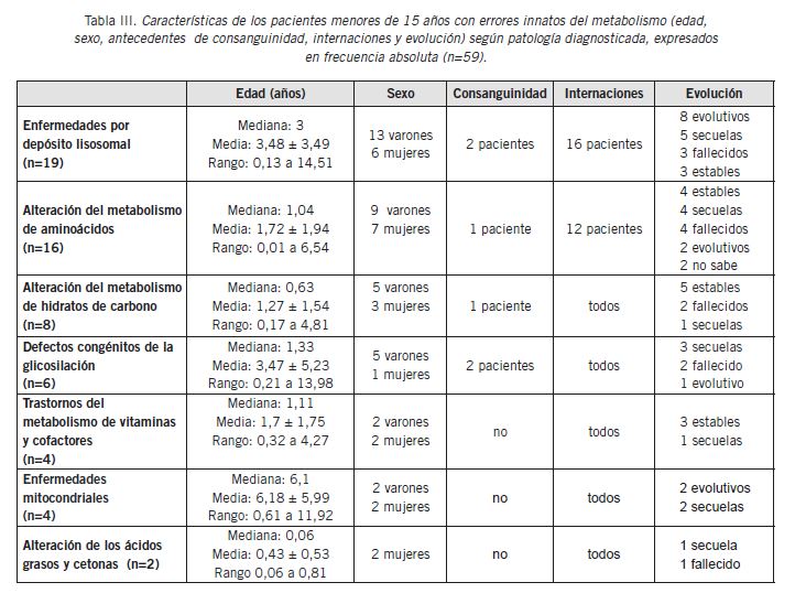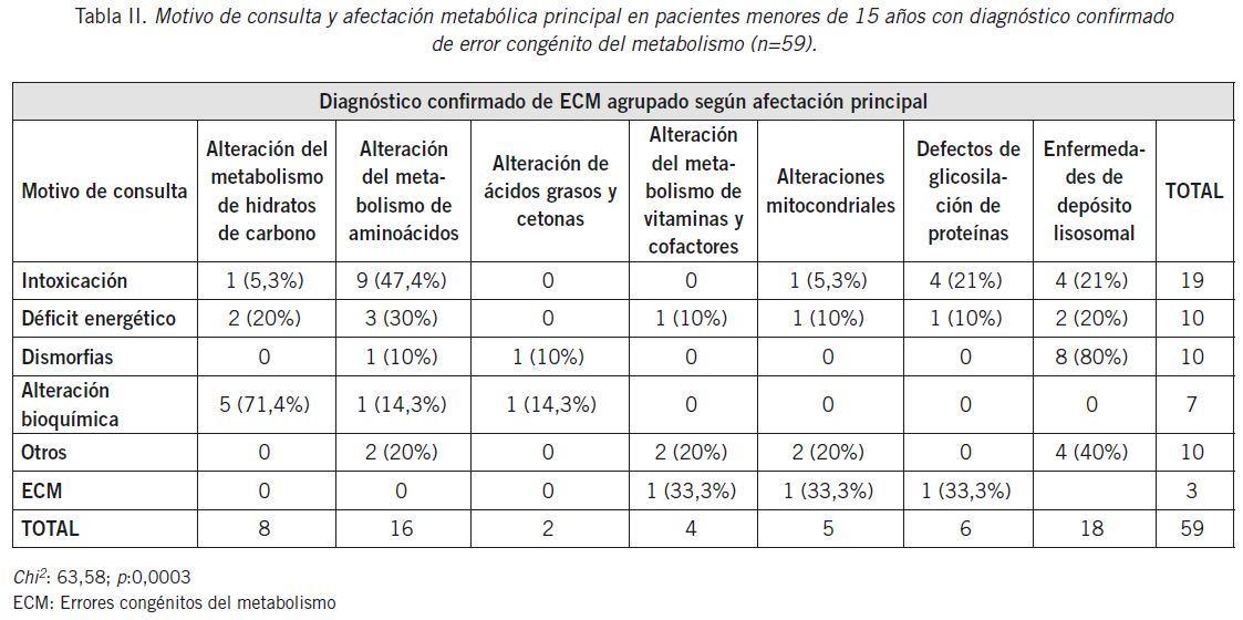 En los pacientes con ECM la edad media en el momento del diagnóstico fue 2,6 años, la relación varón/mujer fue 1,5. El antecedente de consanguinidad estuvo presente en 6 niños (10,2%). Los motivos de consulta se expresan en la Tabla I. Los ECM diagnosticados fueron, en orden decreciente de frecuencia: enfermedades de depósito lisosomal (32,2%), alteración del metabolismo de aminoácidos y acidurias orgánicas (27,1%), alteración del metabolismo de hidratos de carbono (13,5%), CDG (10,2%), alteración del metabolismo de vitaminas y cofactores (6,8%), enfermedades mitocondriales (6,8%), defectos de β-oxidación y metabolismo de cetonas (3,4%). Hubo correspondencia entre el motivo de consulta y el diagnóstico (p=0,003); en el 80% de los derivados por dismorfias se confirmó enfermedad de depósito lisosomal; 47,4% de los derivados por intoxicación tenían alteraciones del metabolismo de aminoácidos y en el 71,4% de los que tenían alteración bioquímica había alteración del metabolismo de hidratos de carbono (Tabla II). Las características de los pacientes con ECM se expresan según la patología en la Tabla III.