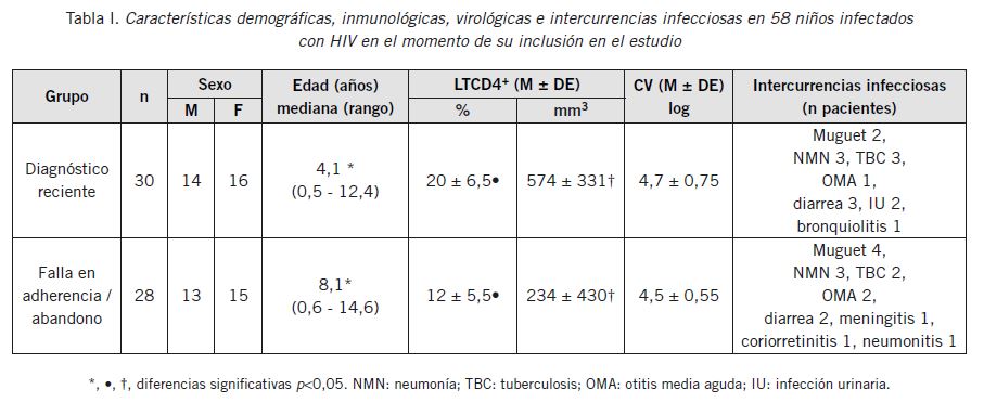 De un total de 486 historias clínicas de niños expuestos a la infección por HIV seguidos en el HGNPE entre los años 2008 y 2018, se seleccionaron 58 correspondientes a pacientes que no recibían TARV. Treinta de las mismas correspondieron a niños con diagnóstico reciente de HIV, mientras que otras veintiocho eran de pacientes que presentaban fallas en la adherencia al TARV o bien abandono del mismo. Los 58 pacientes seleccionados habían adquirido la infección por transmisión vertical. Las principales características demográficas, inmunológicas, virológicas y las patologías infecciosas asociadas presentes en ambos grupos se observan en la Tabla I. La mediana de edad de los niños con debut de enfermedad fue significativamente menor que la de los niños que presentaban adherencia subóptima o abandono de tratamiento. Los valores medios de los niveles porcentuales y absolutos de LTCD4+ de los pacientes con adherencia subóptima presentaron una disminución significativa (p<0,05) respecto a los de los niños con diagnóstico reciente. El valor medio de CV en ambos grupos fue elevado: 4,7 y 4,5 log, respectivamente, sin diferencias significativas entre los mismos. Aproximadamente un 60% de los niños de ambos grupos presentó intercurrencias infecciosas: la neumonía, el muguet y la tuberculosis, fueron las más frecuentes. Otros cuadros como meningitis por Criptococcus neoformans y coriorretinitis por Toxoplasma gondii se desarrollaron en pacientes con fallas en la adherencia y estuvieron asociados a una marcada inmunosupresión y niveles elevados de CV. Cinco pacientes con diagnóstico reciente presentaron cuadros de desnutrición leve o moderada.