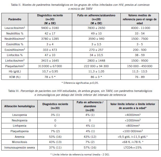 El 53% de los pacientes con diagnóstico reciente de HIV (n=16) presentó niveles disminuidos de Hb y, en trece de ellos se observó disminución del VCM. A su vez, doce niños con adherencia subóptima (43%) tuvieron valores disminuidos de Hb, si bien sólo fue registrada microcitosis en dos de ellos. El porcentaje de pacientes en los que se registró leucopenia, neutropenia, linfopenia y plaquetopenia no exhibió diferencias relevantes entre ambos grupos. Desde el punto de vista inmunológico fue destacable el alto porcentaje de niños con inmunosupresión severa. Once pacientes con diagnóstico reciente (37%) y dieciséis niños que reiniciaron el TARV tras su abandono (57%), presentaron niveles porcentuales de LTCD4+ inferiores al 15%, por lo cual se los incluyó en el estadio de inmunosupresión severa de la clasificación pediátrica del CDC (Tabla III).