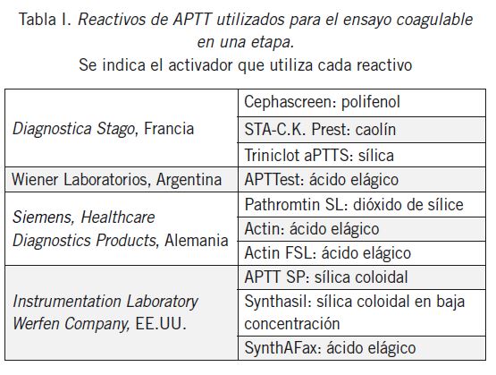 Se utilizó el método coagulable en una etapa con diversos reactivos de APTT (Tabla I).